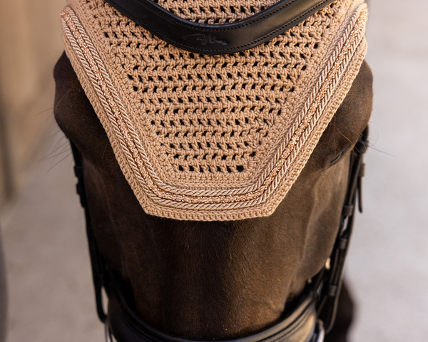 Nauszniki ozdobione aksamitnymi dodatkami i mieniącymi się kryształkami w kolorze materiału. Z przodu znajduje się łatka, na której można wykonać haft. Na czole ścięte z w modny kwadrat. Stworzą idealny komplet z czaprakiem Velvet Mini Pearls